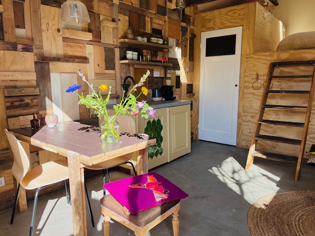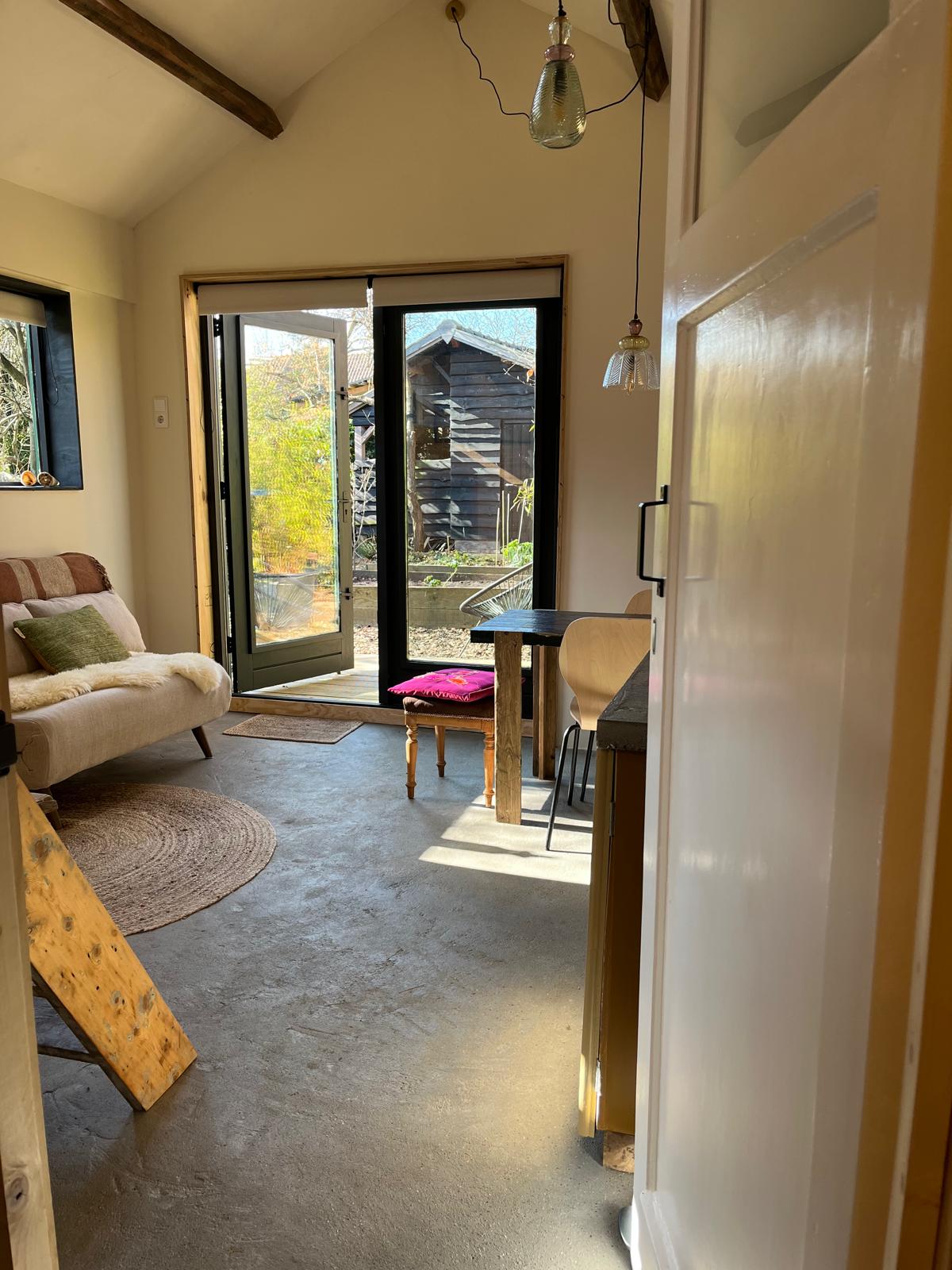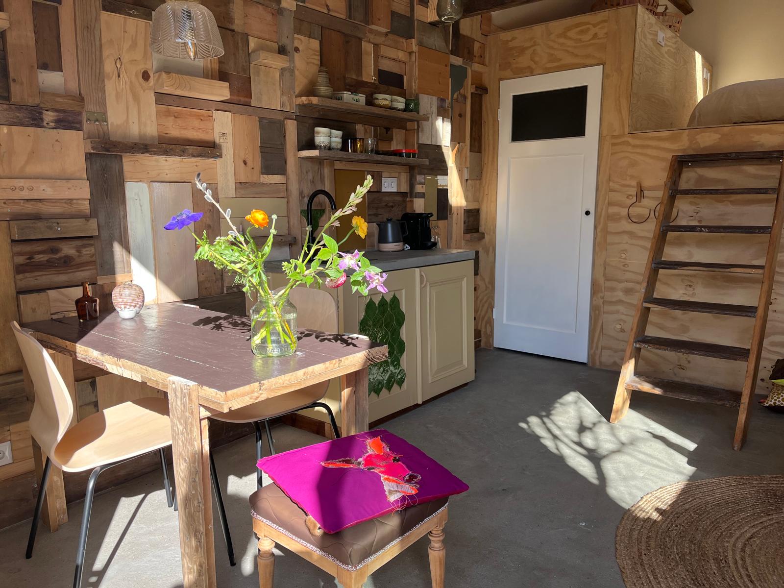Het is een tiny house gelegen in onze weelderige achtertuin. Via een gangetje tussen de huizen heb je een eigen ingang en heel veeæ privacy. We hebben een sleutelkastje, zodat je er altijd in kan.